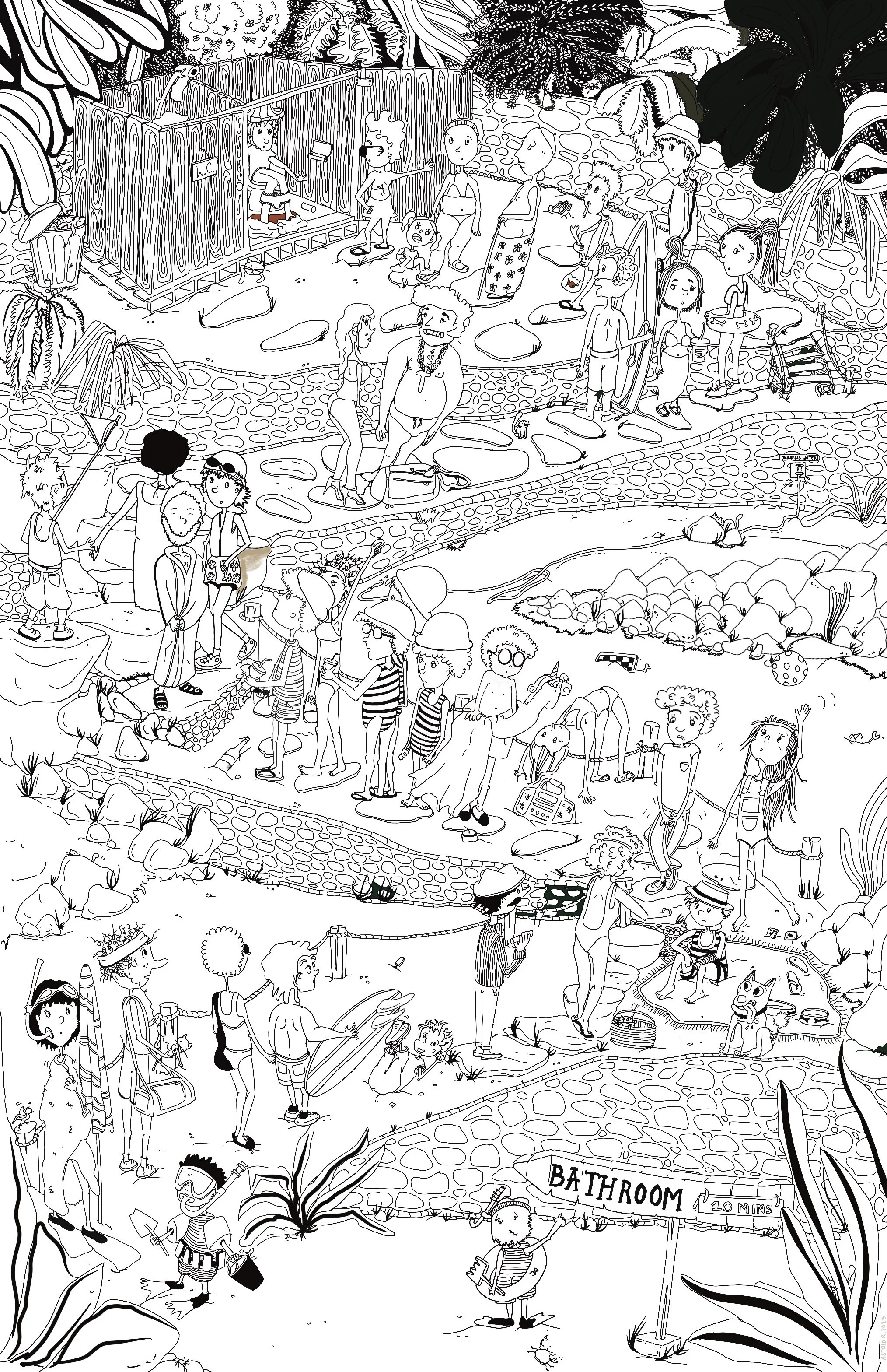 Here is the bathroom line again, but then in black & white (coloring sheet).